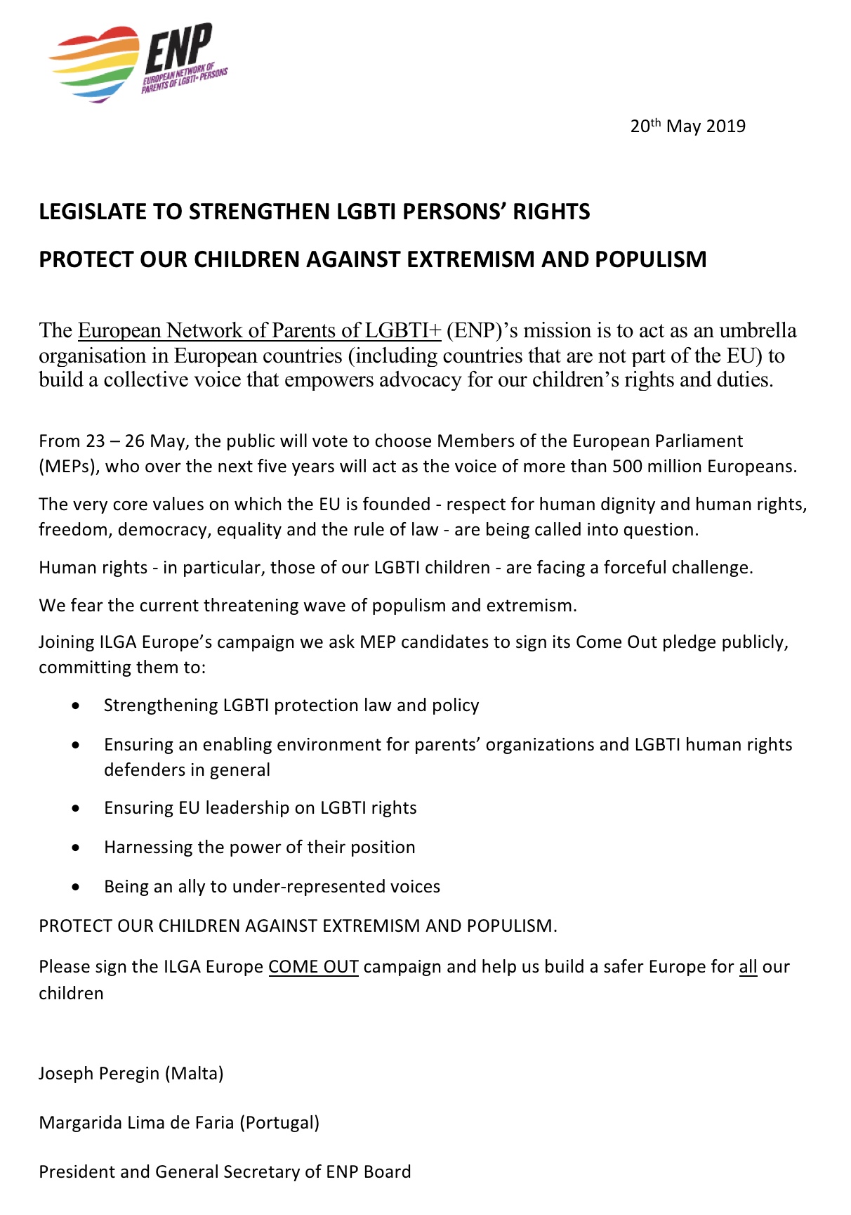 Joining ILGA Europe’s campaign we ask MEP candidates to sign its Come Out pledge publicly, committing them to: