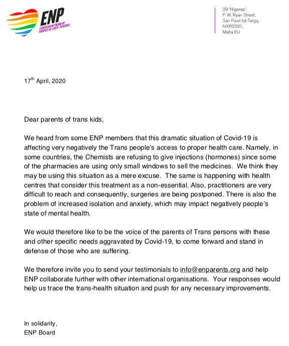 We heard from some ENP members that this dramatic situation of Covid-19 is affecting very negatively the Trans people’s access to proper health care. Namely, in some countries, the Chemists are refusing to give injections (hormones) since some of the pharmacies are using only small windows to sell the medicines. We think they may be using this situation as a mere excuse. The same is happening with health centres that consider this treatment as a non-essential. Also, practitioners are very difficult to reach and consequently, surgeries are being postponed. There is also the problem of increased isolation and anxiety, which may impact negatively people’s state of mental health.